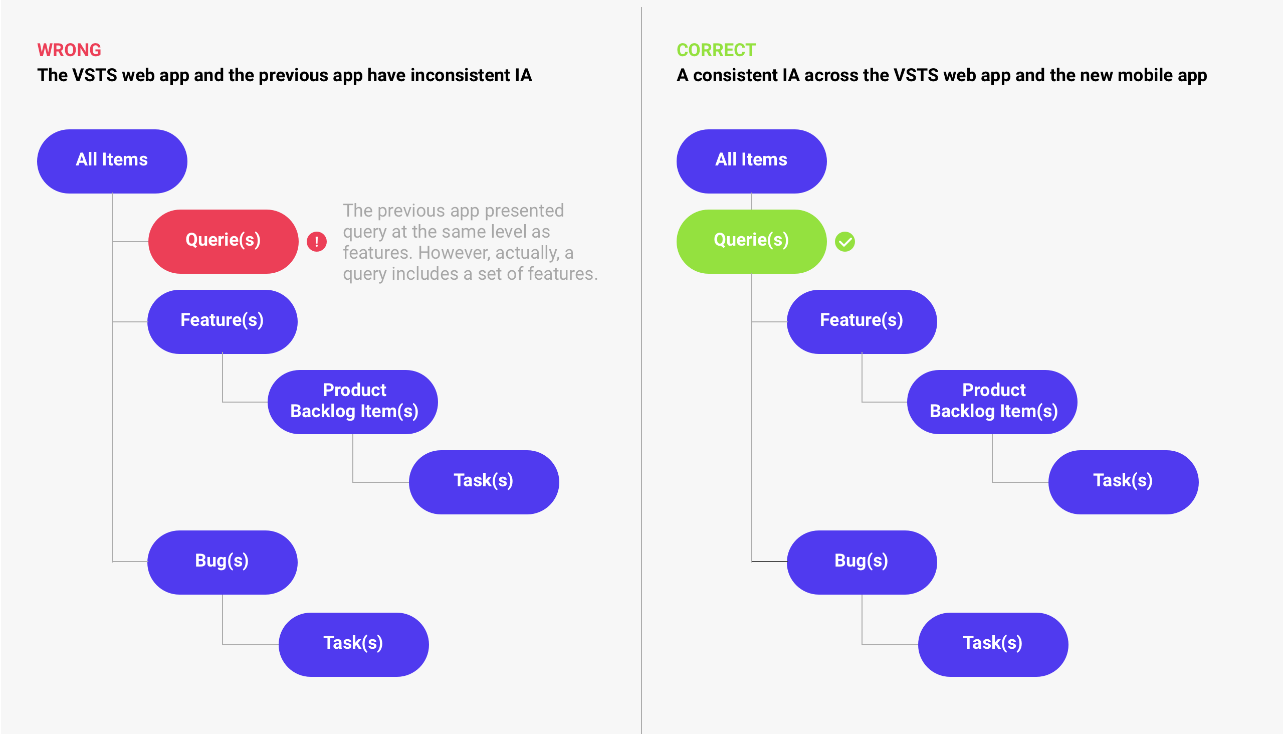 First, I conducted an information architecture analysis on the existing app to pinpoint why the current navigation structure is confusing. The information architecture of the previous app did not match the information architecture of VSTS web app. This discrepancy disrupted users' mental model and caused cognition load as they switched between the web app and the mobile app. To correct the navigation, I brainstormed some new layout options and conducted paper testing.